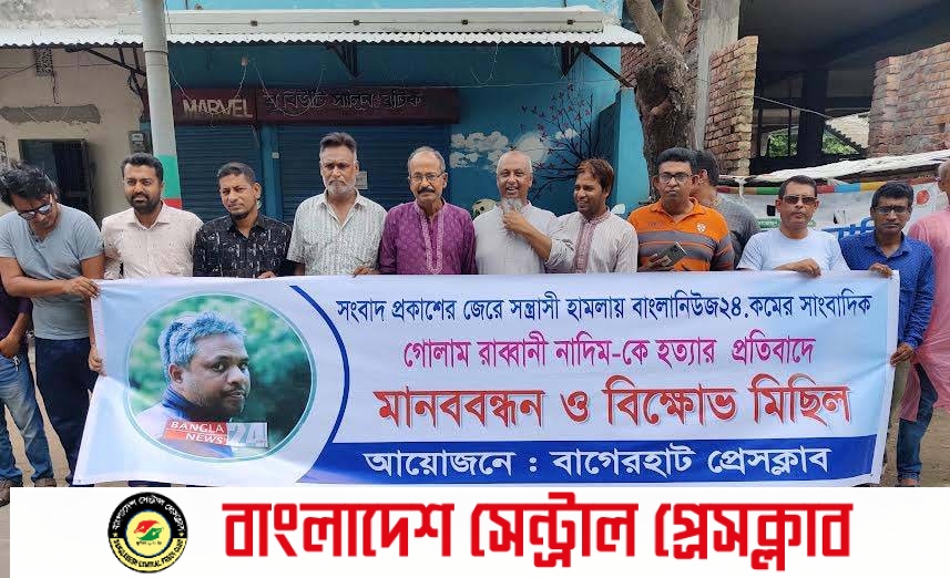 মেহেদী হাসান বাচ্চু বাগেরহাট প্রতিনিধিঃ বাংলানিউজটোয়েন্টিফোর.কমের জামালপুর ডিস্ট্রিক্ট করেসপন্ডেন্ট ও ৭১ টিভির বকশিগঞ্জ উপজেলা সংবাদদাতা গোলাম রাব্বানী নাদিম হত্যার প্রতিবাদে বাগেরহাটে মানববন্ধন কর্মসূচি পালিত হয়েছে। শুক্রবার (১৬ জুন) বেলা ১১টায় বাগেরহাট প্রেসক্লাবের উদ্যোগে প্রেসক্লাবের সামনে এই মানববন্ধন অনুষ্ঠিত হয়।