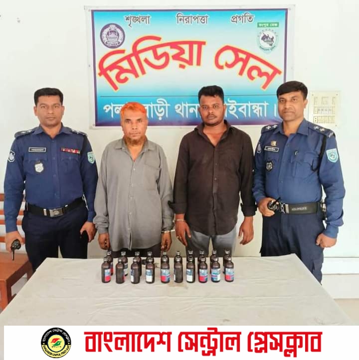 পুলিশ সুপার, গাইবান্ধা মহোদয়ের নির্দেশনা মোতাবেক গাইবান্ধা জেলার পলাশবাড়ী থানাকে মাদকমুক্ত রাখার লক্ষ্যে জনাব মোঃ মাসুদ রানা, অফিসার ইনচার্জ, পলাশবাড়ী থানা, গাইবান্ধা এর সার্বিক তত্ত্বাবধানে এসআই(নিঃ) মোঃ আঃ মান্নান, এর নেতৃত্বে পলাশবাড়ী থানাধীন রংপুর টু ঢাকা মহাসড়কের উপর গাড়ি চেকিং ডিউটি করাকালে ইং-১৩/০৩/২০২৩ তারিখ ১৬:৩০ ঘটিকার সময় গাইবান্ধা টু বগুড়াগামী Abdullah যাত্রীবাহী গেটলক বাস থামিয়ে চেকিং করাকালে ধৃত আসামী ১।মোঃ রাজা মিয়া (৫৪), পিতা-মৃত নুর মিয়া, সাং-চুহাড়, থানা-মিঠাপুকুর, ২।মোঃ সোহেল রানা(৩৫), পিতা-মৃত মজিবর রহমান, সাং-মধ্য বাবু খাঁ, থানা-কোতয়ালী(আরপিএমপি), উভয় জেলা-রংপুর ১নং আসামীর হেফাজত হইতে ১০ বোতল এবং ২নং আসামীর হেফাজত হইতে ১০ বোতল ফেন্সিডিলসহ সর্বমোট ২০(বিশ) বোতল ফেন্সিডিল পাইয়া পলাশবাড়ী থানার মামলা নং-৯/৬০, তারিখ-১৩/০৩/২০২৩, ধারা-৩৬(১) সারণির ১৪(ক)/৪১ মাদকদ্রব্য নিয়ন্ত্রন আইন ২০১৮ রুজু করা হয়।
