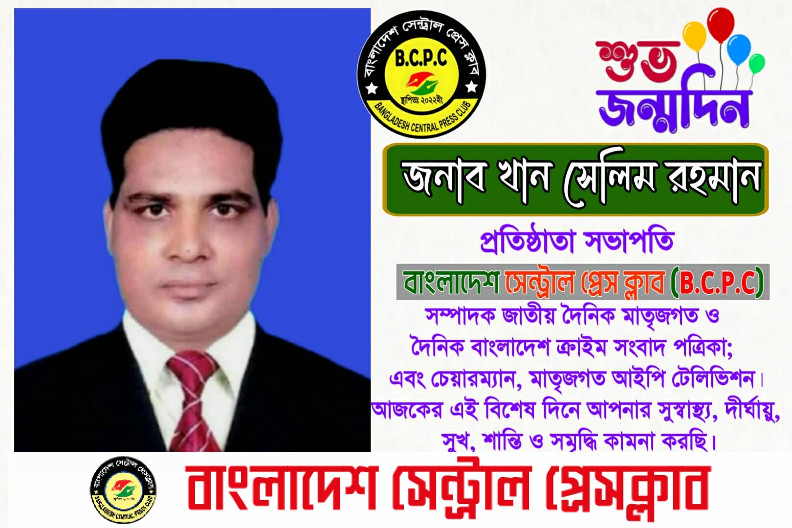 বাংলাদেশ সেন্ট্রাল প্রেস ক্লাব (B.C.P.C)-এর প্রতিষ্ঠাতা সভাপতি ও মানবতার ফেরিওয়ালা খান সেলিম রহমানের ৪৮তম শুভ জন্মদিন আজ