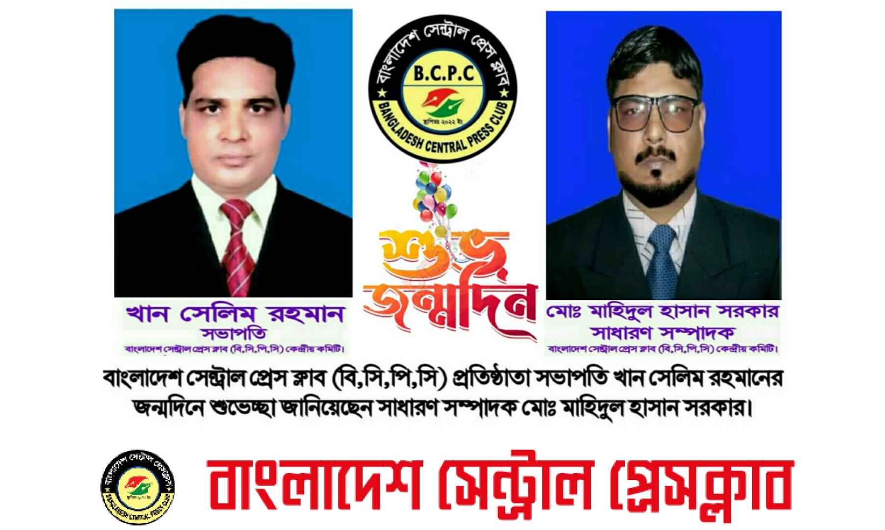 নিজস্ব প্রতিবেদকঃ- আজ জাতীয় দৈনিক মাতৃজগত পত্রিকা ও দৈনিক বাংলাদেশ ক্রাইম সংবাদ পত্রিকা'র সম্পাদক, এশিয়ান টেলিভিশন উপদেষ্টা, বাংলাদেশ সেন্ট্রাল প্রেস ক্লাব (বি,সি,পি,সি) প্রতিষ্ঠাতা সভাপতি, বাংলাদেশ ক্রাইম সাংবাদিক সংগঠন এর প্রতিষ্ঠাতা চেয়ারম্যান, মানবতার ফেরিওয়ালা জনাব খান সেলিম রহমান এর জন্মদিনে শুভেচ্ছা জানিয়েছেন।