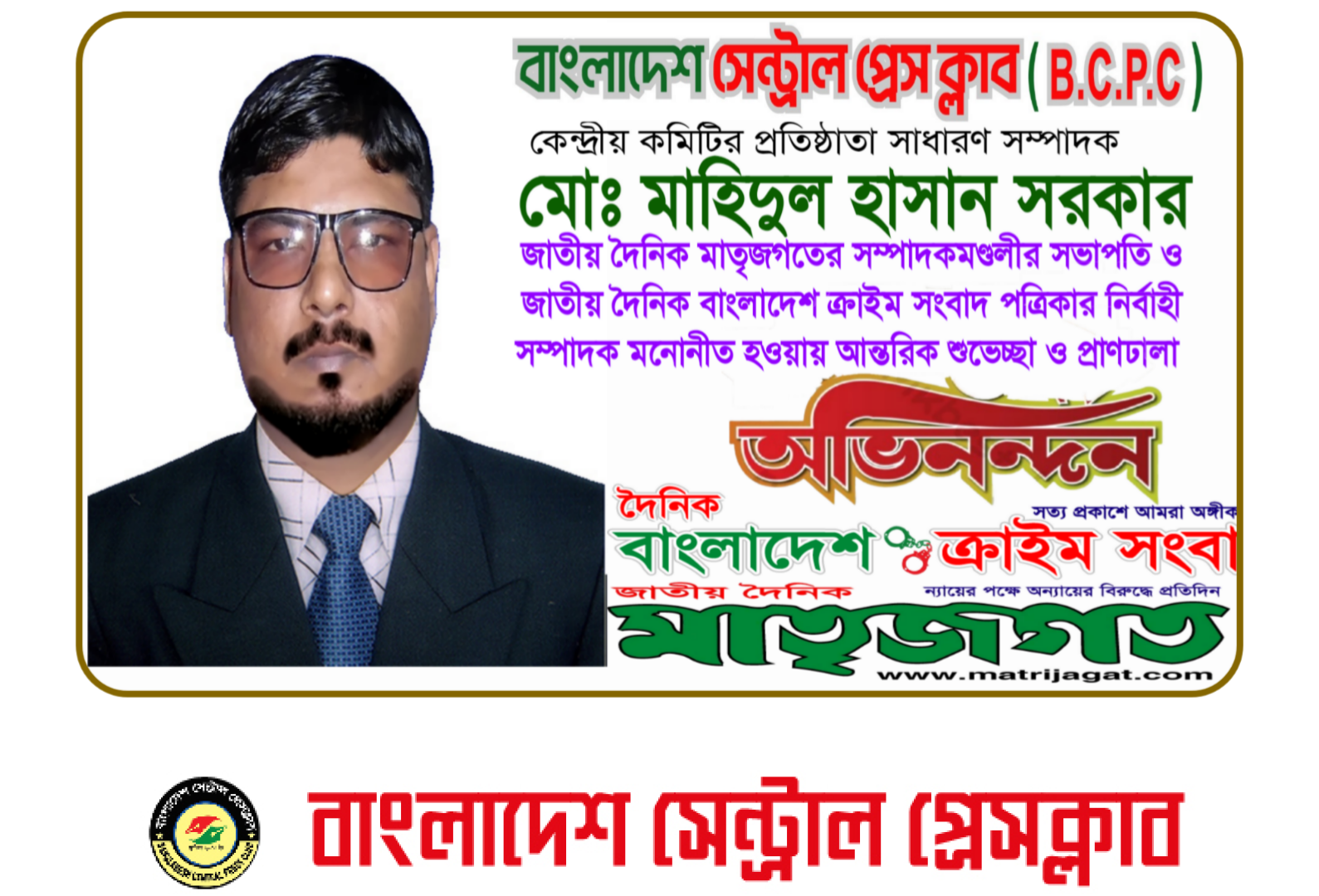 নিজস্ব প্রতিবেদকঃ- বাংলাদেশ সেন্ট্রাল প্রেস ক্লাব (বি.সি.পি.সি)-এর প্রতিষ্ঠাতা সাধারণ সম্পাদক, সাহসী তরুণ সাংবাদিক মোঃ মাহিদুল হাসান সরকারকে জাতীয় দৈনিক মাতৃজগত পত্রিকার সম্পাদকমণ্ডলীর সভাপতি এবং জাতীয় দৈনিক বাংলাদেশ ক্রাইম সংবাদ পত্রিকার নির্বাহী সম্পাদক হিসেবে মনোনীত করা হয়েছে।