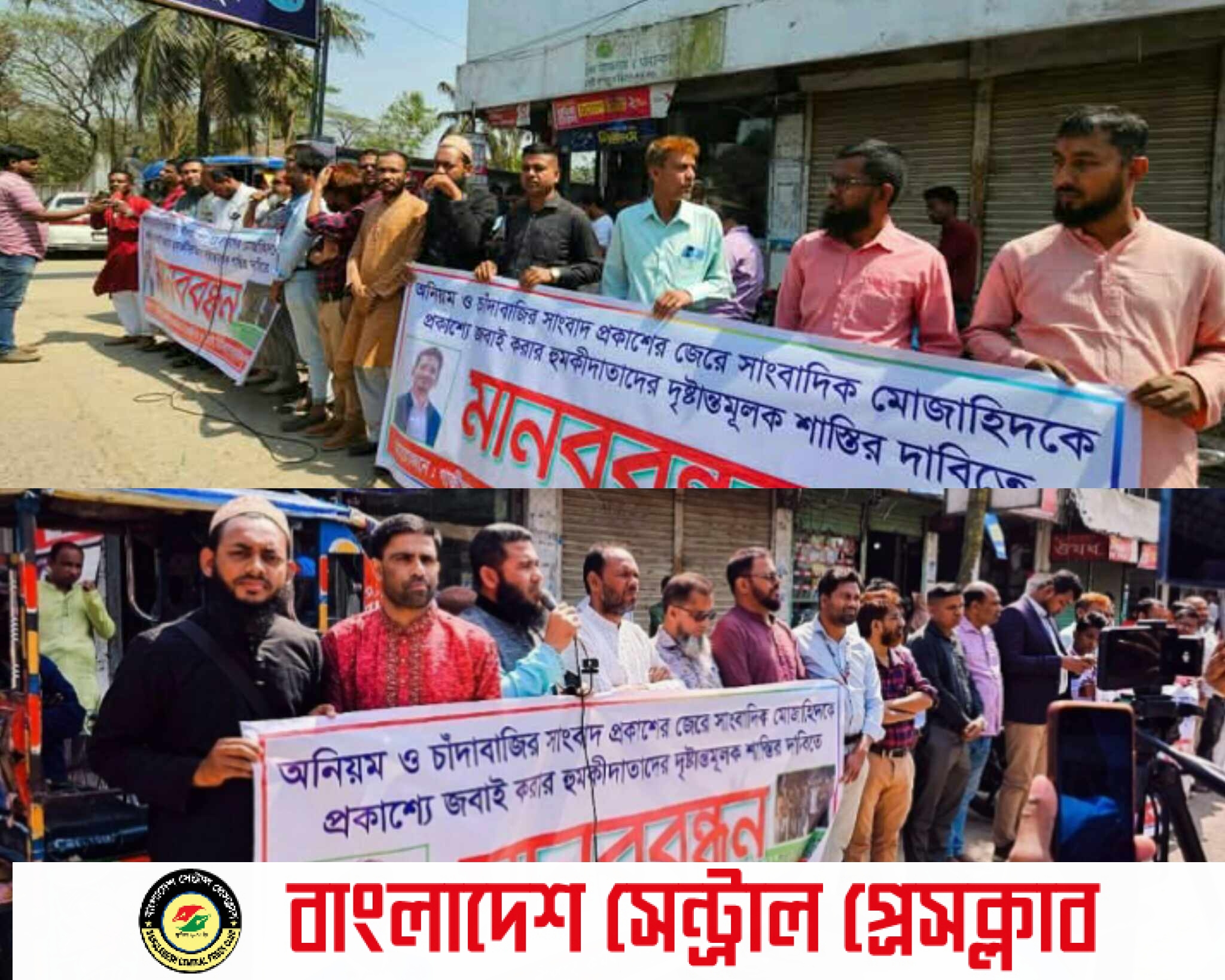 গাজীপুরের শ্রীপুরে অনিয়ম ও চাঁদাবাজির সংবাদ প্রকাশের জেরে সাংবাদিক মোজাহিদকে প্রকাশ্যে জবাই করে হত্যার হুমকির প্রতিবাদে মানববন্ধন অনুষ্ঠিত হয়েছে।