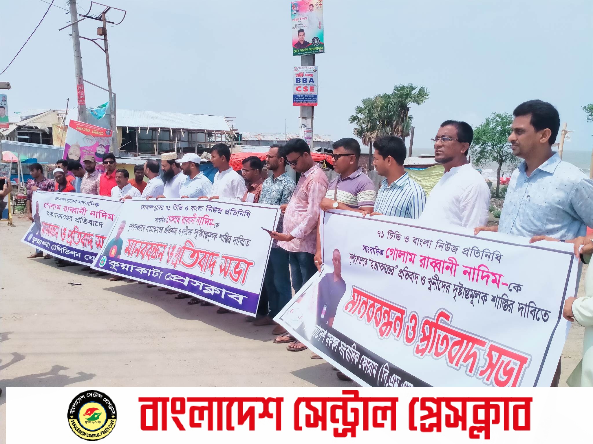 মো: ইলিয়াস শেখ বিশেষ প্রতিনিধিঃ বাংলানিউজ টোয়েন্টিফোর ডটকম,দৈনিক মানবজমিন পত্রিকার উপজেলা প্রতিনিধি ও ৭১ টিভি’র জামালপুর জেলার বকশীগঞ্জ উপজেলার সংবাদ সংগ্রাহক গোলাম রাব্বানী নাদিমের হত্যাকারী ইউপি চেয়ারম্যান মাহমুদুর আলম বাবু সহ জরিত সকল আসামী গ্রেফতার ও তাদের দ্রুত ফাঁসির দাবিতে কুয়াকাটা প্রেসক্লাবের উদ্যোগে বিক্ষোভ ও মানববন্ধন কর্মসূচি অনুষ্ঠিত হয়েছে।