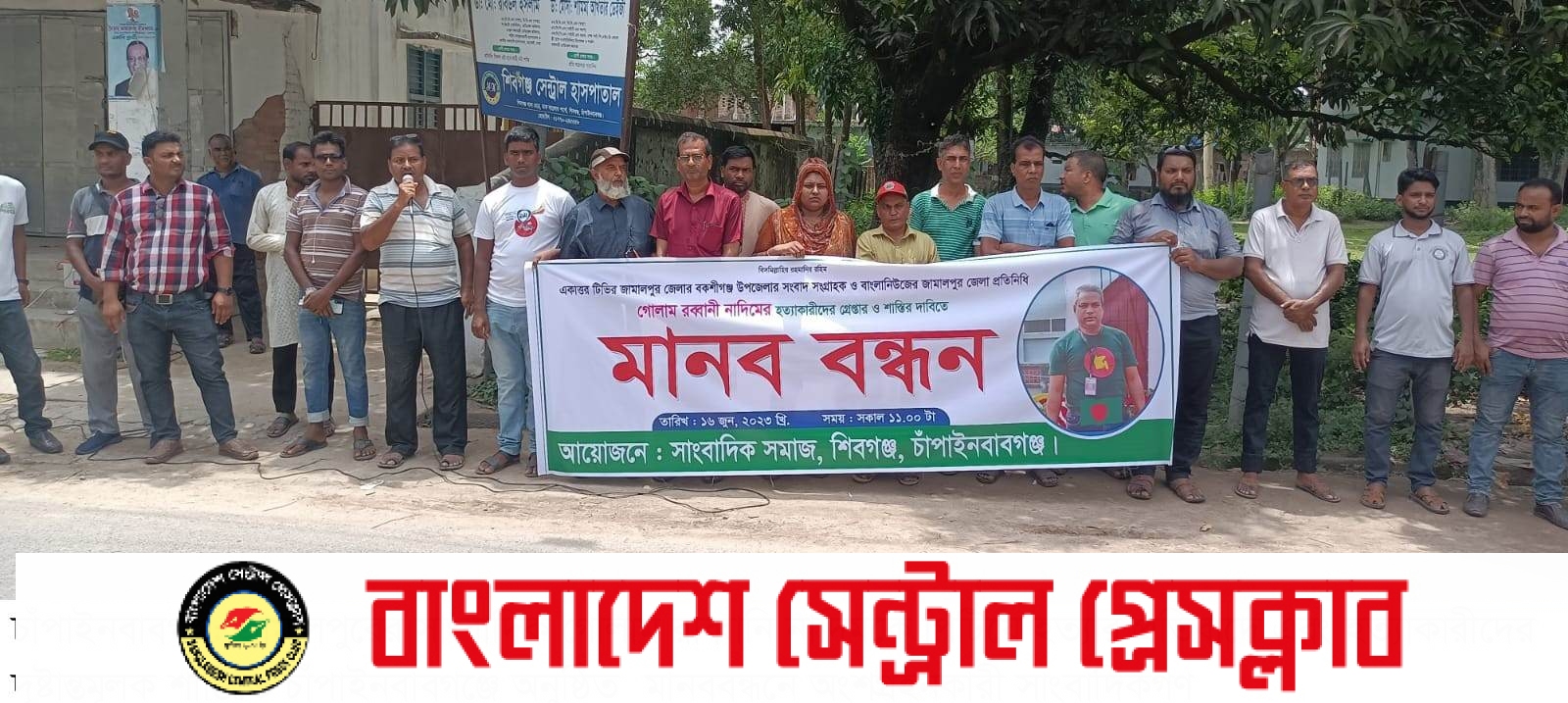 শিবগঞ্জ (চাঁপাইনবাবগঞ্জ) প্রতিনিধিঃ জামালপুরের সাংবাদিক গোলাম রাব্বানী নাদিমকে পিটিয়ে হত্যার প্রতিবাদে এবং হত্যাকারীদের দৃষ্টান্তমূলক শাস্তির দাবিতে চাঁপাইনবাবগঞ্জ শিবগঞ্জে মানববন্ধন অনুষ্ঠিত হয়েছে। শুক্রবার (১৬ জুন) সকাল সাড়ে ১১ টায় শিবগঞ্জ থানার সামনে এ মানববন্ধন অনুষ্ঠিত হয়। সাংবাদিক সমাজের ব্যানারে শিবগঞ্জ উপজেলায় শিবগঞ্জ প্রেসক্লাব, উপজেলা প্রেসক্লাব এবং গৌড় প্রেসক্লাবের সাংবাদিকরা এ মানববন্ধনে অংশ গ্রহন করেন। এতে সংহতি জানিয়ে গোমস্তাপুর উপজেলা প্রেসক্লাবের সভাপতি নুর মোহাম্মদ মানবন্ধনে অংশ গ্রহন করেন। উক্ত