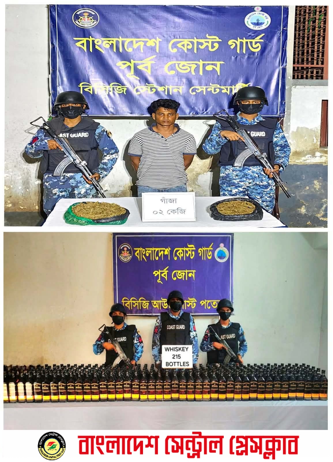 সেন্টমার্টিন ও চট্টগ্রামে বাংলাদেশ কোস্ট গার্ডের পৃথক দুটি অভিযানে বিপুল পরিমাণ গাঁজা ও বিদেশি মদ জব্দ করা হয়েছে। এ সময় এক মাদক কারবারিকে আটক করা হয়েছে।